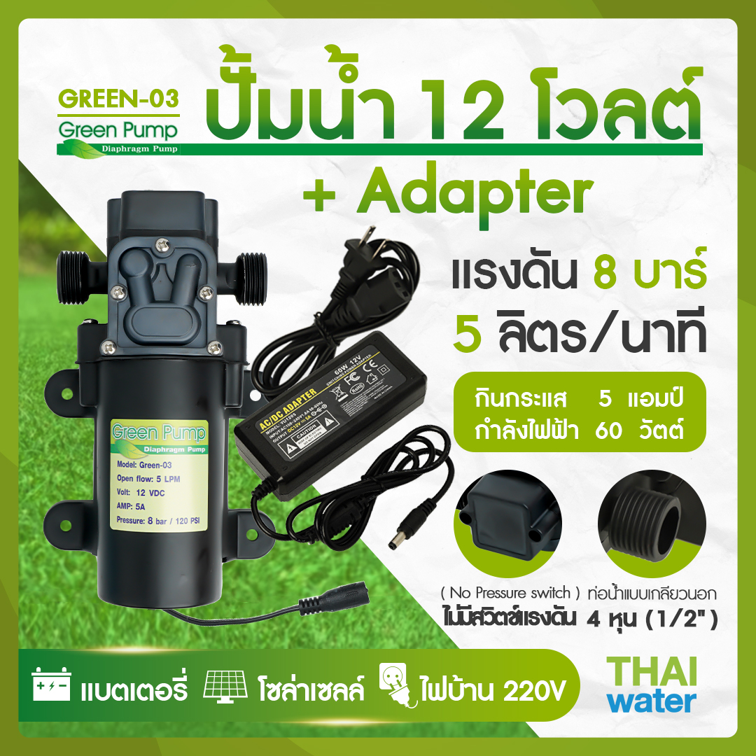 ปั๊มน้ำ ปั๊มพ่นยา DC12V GREEN-03 แรงดัน 8 บาร์ แบบเกลียวนอก 1/2" ( No Pressure switch )Model : Green-03 คุณสมบัติปั๊มน้ำ ปั๊มพ่นยา 12V