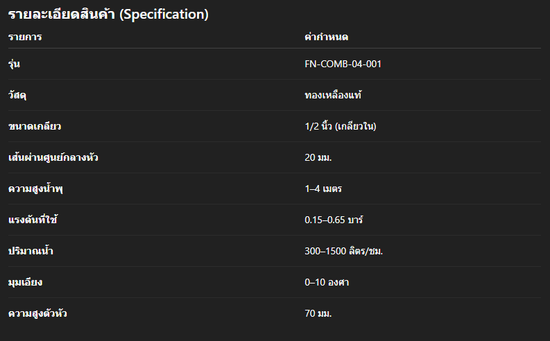 หัวน้ำพุโคเมท (Comet Fountain Nozzle) 1/2 นิ้วเพิ่มความสวยงามให้สวน บ้าน และลานน้ำพุ ด้วยหัวน้ำพุทองเหลืองคุณภาพสูง หัวน้ำพุโคเมทคืออะไรหัวน้ำพุโคเมท หรือ Comet Fountain Nozzle เป็นหัวพ่นน้ำแบบเส้นตรง (Straight Jet Nozzle) ที่นิยมใช้สำหรับ น้ำพุประดับ ทั้งในบ้าน สวน รีสอร์ท โรงแรม หรือพื้นที่สาธารณะ จุดเด่นคือการพ่นน้ำเป็นเส้นตรงสวยงาม น้ำกระจายตัวสม่ำเสมอ และสามารถปรับแรงดันน้ำได้ตามต้องการ
