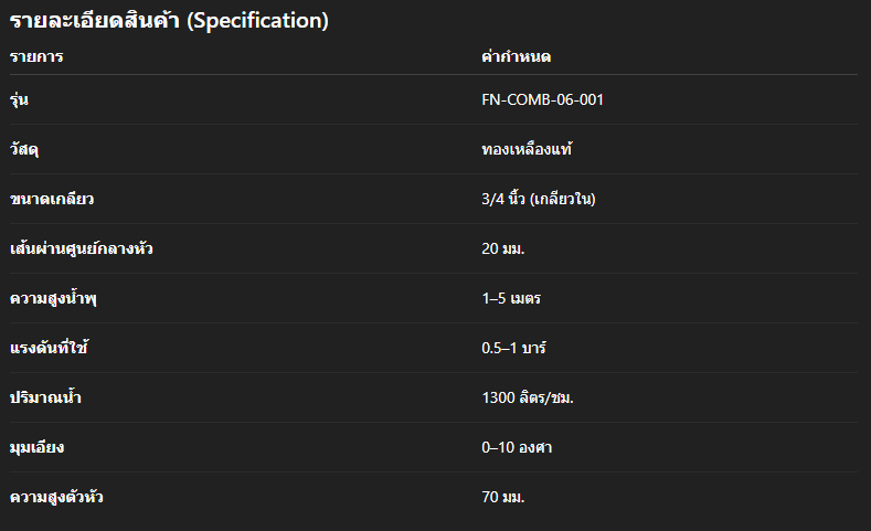 คุณสมบัติเด่น1. วัสดุทองเหลืองคุณภาพสูงผลิตจากทองเหลืองแท้ ไม่เป็นสนิม ทนต่อการกัดกร่อน ใช้งานได้ยาวนาน 2. สายน้ำเป็นเส้นตรงออกแบบมาให้พ่นน้ำเป็นเส้นตรงสวยงาม ดูหรูหราและโดดเด่น 3. รองรับแรงดันน้ำทั่วไปทำงานได้ดีที่แรงดันน้ำ 0.5–1 บาร์ ใช้ได้กับปั๊มน้ำบ้านและปั๊มอุตสาหกรรม 4. ปริมาณน้ำสูง 1300 ลิตร/ชม.ให้น้ำที่ไหลแรง สม่ำเสมอ เหมาะกับบ่อน้ำพุขนาดกลางถึงใหญ่ 5. มุมเอียงปรับได้สามารถปรับมุมเอียงได้ 0–10 องศา เพื่อให้เหมาะกับการออกแบบน้ำพุ วิธีติดตั้งและการใช้งาน