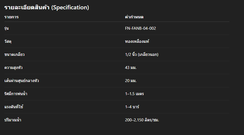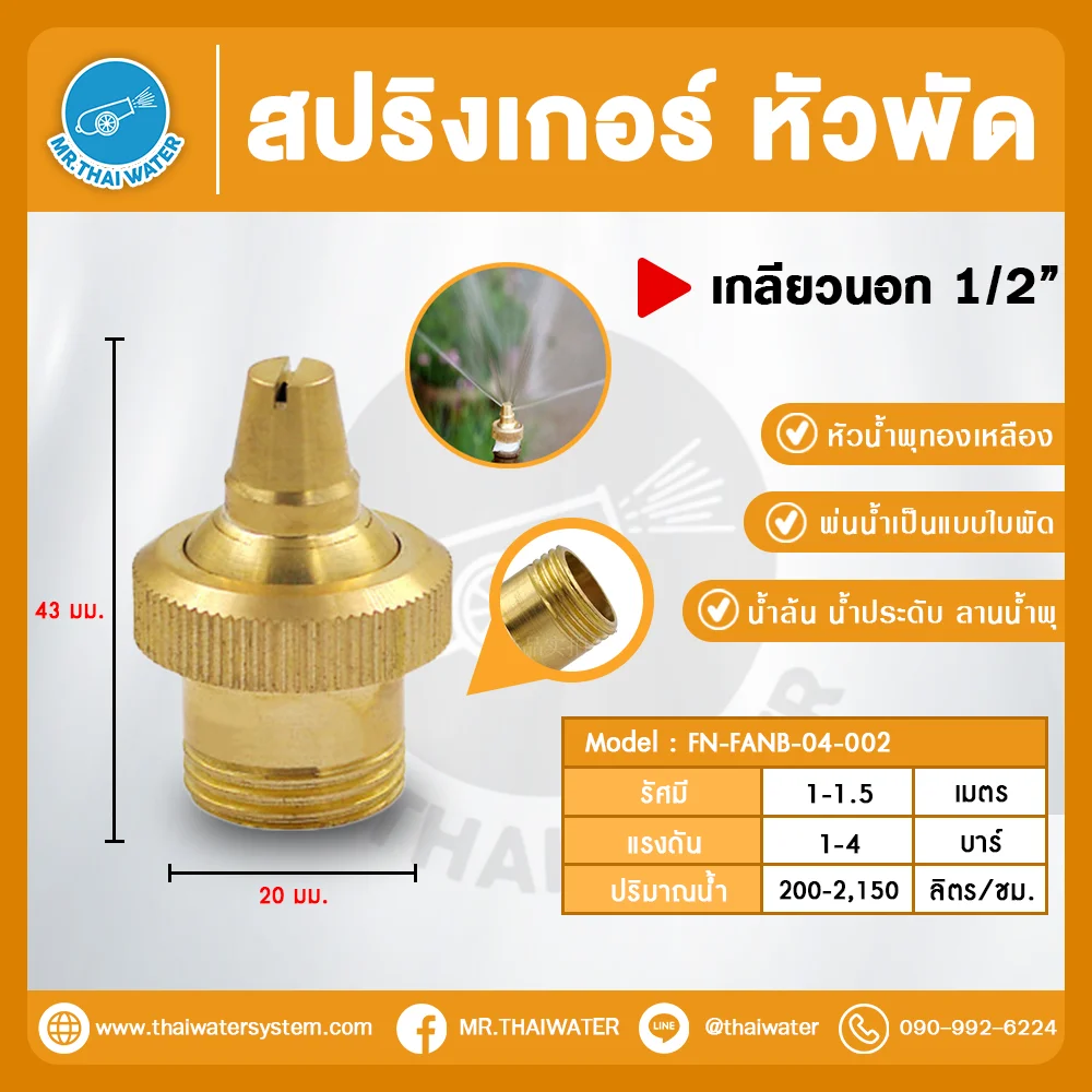 สปริงเกอร์หัวพัดทองเหลือง FN-FANB-04-002 เกลียวนอก 1/2 นิ้ว เป็นหัวพ่นน้ำคุณภาพสูง แข็งแรงทนทาน เหมาะสำหรับ รดน้ำสวน เกษตร และงานน้ำพุประดับ กระจายน้ำสม่ำเสมอ ครอบคลุมพื้นที่รัศมี 1–1.5 เมตร