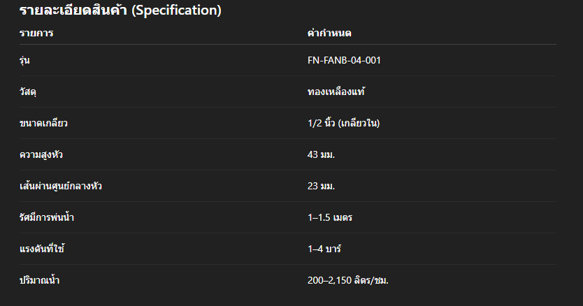 สปริงเกอร์หัวพัดทองเหลือง FN-FANB-04-001 เกลียวใน 1/2 นิ้ว แข็งแรงทนทาน เหมาะสำหรับ สวนเกษตร สวนหย่อม สนามหญ้า และงานน้ำพุประดับ พ่นน้ำแบบใบพัดครอบคลุมรัศมี 1–1.5 เมตร รองรับแรงดัน 1–4 บาร์ ใช้งานได้ทั้งบ้านและเกษตรกรรม