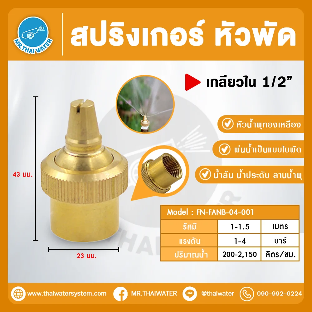 สปริงเกอร์หัวพัดทองเหลือง 1/2 นิ้ว (Brass Fan Spray Nozzle)หัวพ่นน้ำแบบพัดสำหรับรดน้ำต้นไม้ เกษตร และน้ำพุประดับ แข็งแรง ใช้งานง่าย สปริงเกอร์หัวพัดคืออะไรสปริงเกอร์หัวพัด (Fan Spray Nozzle) เป็นหัวพ่นน้ำที่ออกแบบให้กระจายน้ำในลักษณะ ใบพัด คล้ายน้ำพัดออกเป็นแผง ช่วยให้การรดน้ำมีความสม่ำเสมอและทั่วถึง เหมาะสำหรับการรดน้ำต้นไม้ สวนผัก สวนผลไม้ สนามหญ้า รวมถึงสามารถนำไปใช้กับงานน้ำพุประดับขนาดเล็กได้ด้วย คุณสมบัติหลัก: