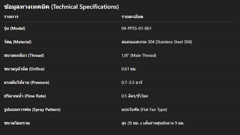 หัวฉีดสเปรย์ใบพัด เกลียว 1/8 นิ้ว สแตนเลส 304 รุ่น 04-PPSS-01-061การกระจายน้ำอย่างมีประสิทธิภาพคือหัวใจสำคัญของระบบพ่นน้ำ ไม่ว่าจะเป็นในงานเกษตร อุตสาหกรรม หรือระบบล้างทำความสะอาด หากคุณกำลังมองหาหัวฉีดที่ให้ละอองน้ำสม่ำเสมอและประหยัดน้ำ หัวฉีดสเปรย์ใบพัด (Fan Spray Nozzle) รุ่น 04-PPSS-01-061 จาก MR. THAI WATER คือคำตอบที่ลงตัวที่สุด หัวฉีดรุ่นนี้ถูกออกแบบให้พ่นน้ำในลักษณะ “ใบพัด” (Flat Fan Pattern) ที่กระจายกว้างและละเอียด ใช้วัสดุ สแตนเลส 304 ซึ่งแข็งแรง ไม่เป็นสนิม เหมาะกับการใช้งานกลางแจ้ง หรือในโรงงานที่ต้องการความทนทานสูง จุดเด่นของหัวฉีดสเปรย์ใบพัด รุ่น 04-PPSS-01-061พ่นน้ำแบบพัดกระจายกว้างหัวฉีดใบพัดถูกออกแบบให้กระจายน้ำเป็นรูปแผ่นพัด (Fan Type Spray) ทำให้ละอองน้ำกระจายสม่ำเสมอทั่วพื้นที่ เหมาะสำหรับงานที่ต้องการเคลือบผิว ล้างทำความสะอาด หรือพ่นน้ำลดอุณหภูมิ วัสดุสแตนเลสเกรด 304ผลิตจาก Stainless Steel 304 คุณภาพสูง ไม่เป็นสนิม ทนแรงดันและทนสารเคมี เหมาะสำหรับใช้งานในสภาพแวดล้อมที่เปียกชื้นหรือมีการกัดกร่อน เช่น โรงงานอาหาร ระบบพ่นเคมี และพื้นที่กลางแจ้ง รูหัวฉีดขนาด 0.61 มม.ให้ละอองน้ำละเอียดมาก ใช้น้ำเพียง 0.5 ลิตรต่อชั่วโมง ที่แรงดันเพียง 0.7–3.5 บาร์ เหมาะกับการใช้งานที่ต้องการความประหยัดน้ำ เช่น ระบบพ่นหมอก หรือ Cooling System มาตรฐานเกลียว 1/8 นิ้วติดตั้งง่าย เข้ากันได้กับข้อต่อและท่อมาตรฐานทั่วไป ใช้งานได้กับระบบพ่นน้ำทั้งขนาดเล็กและอุตสาหกรรม ประโยชน์การใช้งานของหัวฉีดสเปรย์ใบพัด1. งานล้างทำความสะอาดหัวฉีดใบพัดให้แรงพ่นน้ำกระจายกว้าง เหมาะสำหรับใช้ล้างพื้น ล้างเครื่องจักร หรืออุปกรณ์ที่ต้องการแรงพ่นสูงแต่ประหยัดน้ำ 2. งานพ่นสารเคมีสามารถใช้พ่นสารเคมี ปุ๋ย หรือน้ำยาฆ่าเชื้อในภาคเกษตรหรือโรงงานได้อย่างสม่ำเสมอ ปลอดภัยต่ออุปกรณ์และวัสดุรอบข้าง 3. งานระบายความร้อน / ลดอุณหภูมิเหมาะกับระบบ Cooling System หรือการพ่นละอองในพื้นที่ร้อน เช่น โรงเรือน ฟาร์ม หรือคาเฟ่กลางแจ้ง ช่วยลดอุณหภูมิได้ 3–5°C 4. งานตกแต่งและระบบหมอกสามารถใช้ในงานตกแต่งสวยงาม เช่น พ่นละอองน้ำตก น้ำพุ หรือพื้นที่พักผ่อนในสวน การติดตั้งและดูแลรักษา1️⃣ ติดตั้งง่าย เพียงหมุนเข้าข้อต่อเกลียว 1/8" มาตรฐาน การใช้งานในอุตสาหกรรมต่าง ๆ