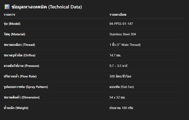 💦 หัวฉีดสเปรย์ใบพัด สแตนเลส 304 รุ่น 04-PPSS-01-147 เกลียว 1 นิ้ว (รูหัวฉีด 14.7 มม.)หัวฉีดสเปรย์ใบพัดรุ่น 04-PPSS-01-147 จาก MR. THAI WATER หัวฉีดรุ่นนี้ผลิตจาก สแตนเลสแท้เกรด 304 (Stainless Steel 304) ที่มีความแข็งแรง ทนแรงดันสูง และทนต่อสารเคมีได้ดี ใช้งานได้ทั้งในสภาพแวดล้อมที่เปียกชื้นหรือร้อนจัด โดยไม่เกิดสนิม ⚙️ คุณสมบัติเด่น (Key Features)1️⃣ พ่นน้ำแบบพัดแผ่นกว้าง (Flat Fan Spray)ออกแบบให้กระจายน้ำในรูปแบบพัด เพื่อให้ครอบคลุมพื้นที่ได้กว้างและสม่ำเสมอ 2️⃣ รูหัวฉีดขนาด 14.7 มม. ให้แรงพ่นทรงพลังรูขนาดใหญ่พิเศษช่วยให้ปริมาณน้ำมากถึง 300 ลิตรต่อชั่วโมง 3️⃣ วัสดุสแตนเลสเกรด 304 ทนทานทุกสภาพแวดล้อมผลิตจาก Stainless Steel 304 ที่มีคุณสมบัติทนการกัดกร่อน ไม่เป็นสนิม และทนแรงดันสูงได้ดี 4️⃣ เกลียวขนาด 1 นิ้ว มาตรฐานอุตสาหกรรมสามารถต่อเข้ากับระบบท่อน้ำแรงดันสูง หรือข้อต่ออุตสาหกรรมได้ทันที 🌿 การใช้งาน (Applications)💧 ภาคอุตสาหกรรม