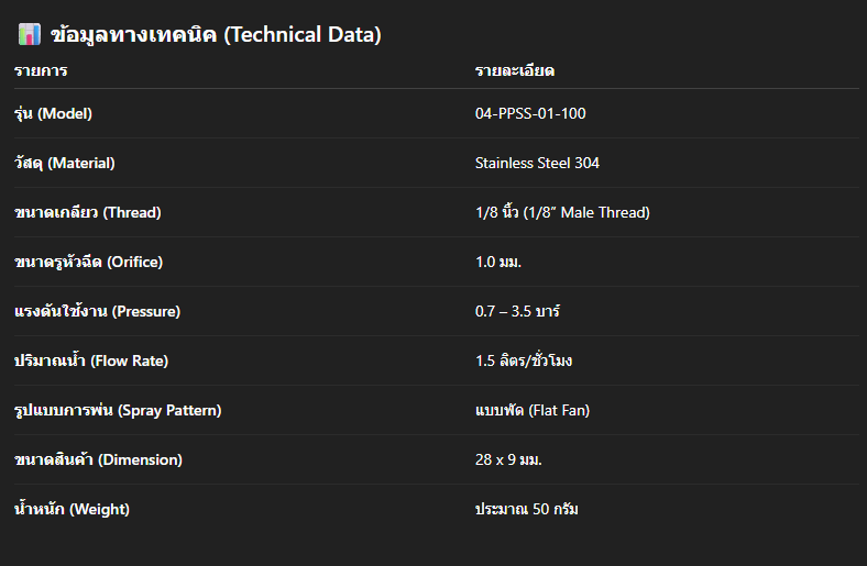 🔍 ทำไมต้องเลือกหัวฉีดจาก MR. THAI WATER✅ ผลิตจาก สแตนเลสแท้ 304 คุณภาพสูง 🧩 สรุปคุณสมบัติเด่นของรุ่น 04-PPSS-01-100