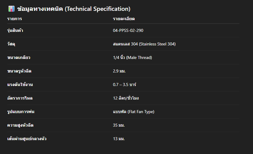 💦 หัวฉีดสเปรย์ใบพัด สแตนเลส 304 รุ่น 04-PPSS-02-290 (รูหัวฉีด 2.9 มม.)หัวฉีดพ่นน้ำรุ่น 04-PPSS-02-290 จาก MR. THAI WATER ด้วยขนาดรูหัวฉีด 2.9 มม. สามารถพ่นน้ำได้แรง ปริมาณมาก และกระจายละอองแบบพัดกว้าง เหมาะกับงานที่ต้องการความครอบคลุม เช่น Cooling Tower, ล้างพื้น, พ่นเคมี, ลดอุณหภูมิพื้นที่กลางแจ้ง และ ระบบระบายฝุ่น ⚙️ จุดเด่นของสินค้า🔹 รูหัวฉีด 2.9 มม. พ่นแรงระดับอุตสาหกรรมหัวฉีดรุ่นนี้ให้อัตราการไหลสูงถึง 12 ลิตร/ชั่วโมง ภายใต้แรงดัน 0.7–3.5 บาร์ 🔹 พ่นน้ำแบบพัดกว้าง (Flat Fan)หัวฉีดออกแบบให้พ่นน้ำเป็นแนวพัด ทำให้ละอองน้ำกระจายเท่ากันตลอดแนว 🔹 วัสดุสแตนเลสแท้เกรด 304