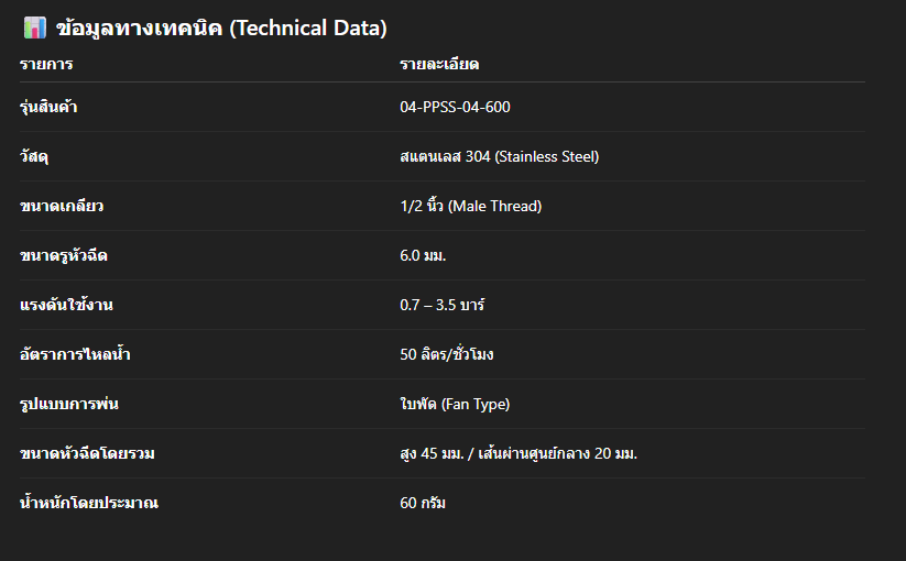 💧 หัวฉีดสเปรย์ใบพัดสแตนเลส 304 รุ่น 04-PPSS-04-600 (รูหัวฉีด 6.0 มม.)หัวฉีดพ่นน้ำใบพัด รุ่น 04-PPSS-04-600 จาก MR.THAI WATER รุ่นนี้มีขนาดเกลียว 1/2 นิ้ว (Male Thread) พร้อมรูหัวฉีด 6.0 มม. ⚙️ จุดเด่น (Features)✅ พ่นแบบใบพัด (Flat Fan Spray)กระจายน้ำเป็นรูปพัดอย่างสม่ำเสมอ ครอบคลุมพื้นที่กว้าง ✅ วัสดุสแตนเลสแท้ 304ทนทานต่อการกัดกร่อน ใช้ได้ทั้งในงานที่มีสารเคมี ความชื้น หรือแรงดันสูง ✅ เกลียวมาตรฐาน 1/2 นิ้วติดตั้งง่าย เข้ากับข้อต่อทุกชนิด ทั้งทองเหลือง สแตนเลส และ PVC ✅ พ่นแรง ละอองกระจายกว้างเหมาะสำหรับงานพ่นที่ต้องการแรงพ่นสูง เช่น ระบบล้างเครื่องจักร พ่นควันน้ำ Cooling ✅ รองรับแรงดันสูงทำงานได้ดีในช่วงแรงดัน 0.7–3.5 บาร์ โดยไม่รั่วซึมหรือแตกหัก 🌾 การใช้งาน (Applications)🏭 งานอุตสาหกรรม