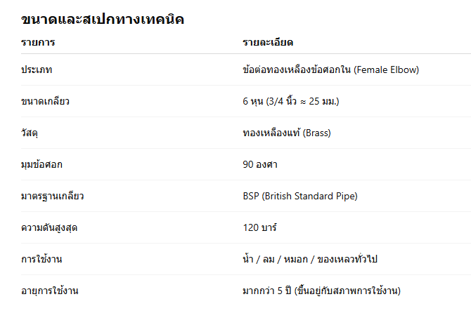 ข้อต่อทองเหลืองข้อศอกใน 6 หุน (3/4 นิ้ว) – แข็งแรง ทนแรงดันสูง ใช้ได้ทั้งน้ำและลมข้อต่อทองเหลืองข้อศอกใน 6 หุน คืออะไรข้อต่อทองเหลืองข้อศอกใน 6 หุน หรือ Brass Female Elbow 3/4” เป็นอุปกรณ์ที่ใช้ต่อท่อในมุม 90 องศา เพื่อเปลี่ยนทิศทางการไหลของน้ำ ลม หรือของเหลว โดยออกแบบให้ เป็นเกลียวใน (Female Thread) เหมาะสำหรับเชื่อมต่อกับข้อต่อเกลียวภายนอกที่มีขนาดเท่ากัน (3/4 นิ้ว หรือ 25 มม.) วัสดุทองเหลืองแท้ (Brass) ทำให้ทนแรงดันสูงได้ดี ไม่เป็นสนิม และเหมาะสำหรับการใช้งานในทุกสภาพอากาศ ทั้งระบบภายในอาคารและกลางแจ้ง เช่น