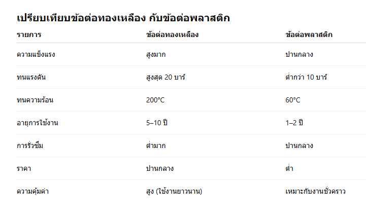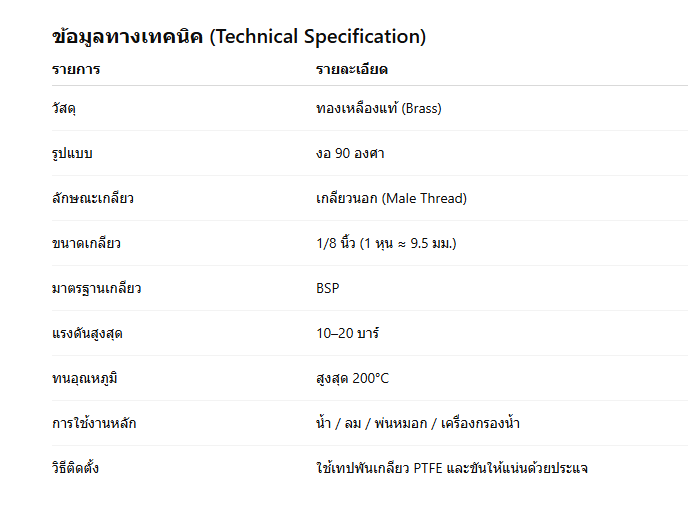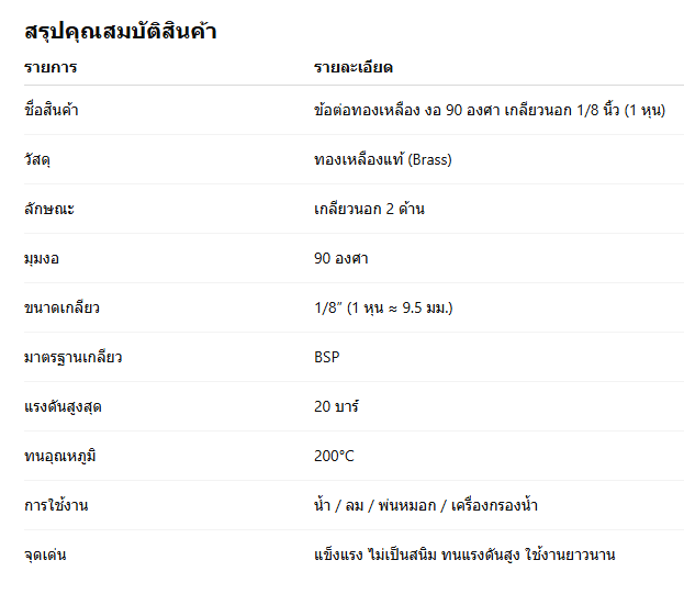ข้อต่อทองเหลือง งอ 90 องศา เกลียวนอก 1/8 นิ้ว (1 หุน)ข้อต่อทองเหลืองงอ 90 องศา เกลียวนอก 1/8 นิ้ว (1 หุน) เป็นข้อต่อขนาดเล็กที่มีความสำคัญในระบบท่อ ทั้งระบบน้ำ ระบบลม และระบบพ่นหมอก ใช้สำหรับเปลี่ยนทิศทางการไหลของของเหลวหรือลมในมุมฉาก 90 องศา ด้วยขนาดเกลียว 1/8 นิ้ว หรือประมาณ 9.5 มิลลิเมตร (1 หุน) ซึ่งเป็นขนาดมาตรฐานสำหรับระบบแรงดันต่ำ–กลาง ผลิตจาก ทองเหลืองแท้ (Brass) เกรดอุตสาหกรรม แข็งแรง ไม่เป็นสนิม ทนแรงดันสูง ใช้งานได้ยาวนาน เหมาะสำหรับงานติดตั้งในพื้นที่จำกัด เช่น จุดต่อหัวพ่นหมอก ปั๊มน้ำขนาดเล็ก หรือระบบท่อลมในเครื่องจักร คุณสมบัติเด่นของข้อต่อทองเหลืองงอ 90 องศา เกลียวนอก 1/8 นิ้ว1. ผลิตจากทองเหลืองแท้คุณภาพสูงข้อต่อรุ่นนี้ผลิตจากทองเหลืองแท้ (Brass) ที่มีคุณสมบัติแข็งแรง ทนต่อแรงดันและอุณหภูมิสูง ไม่เปราะ แตก หรือบิดงอง่ายเมื่อใช้งานระยะยาว 2. เกลียวนอกละเอียด มาตรฐาน BSP 1/8”ข้อต่อทองเหลืองเกลียวนอก 1/8 นิ้ว ใช้มาตรฐาน BSP (British Standard Pipe) ซึ่งนิยมในระบบน้ำและระบบลม สามารถใช้ร่วมกับอุปกรณ์ที่มีเกลียวในขนาดเดียวกันได้พอดี 3. ทนแรงดันและอุณหภูมิสูงรองรับแรงดันได้สูงกว่า 10–20 บาร์ และทนความร้อนได้ถึง 200°C ใช้งานได้ทั้งระบบแรงดันน้ำและแรงดันลม 4. ขนาดกะทัดรัด ติดตั้งง่ายเหมาะสำหรับจุดที่มีพื้นที่จำกัด เช่น ในปั๊มแรงดัน หัวพ่นหมอก เครื่องกรองน้ำ หรือระบบท่อลมที่ต้องการมุมฉาก 90° 5. ไม่เป็นสนิมและไม่กัดกร่อนทองเหลืองเป็นโลหะที่ทนต่อการกัดกร่อนและไม่เป็นสนิม เหมาะกับสภาพอากาศชื้นหรือการใช้งานกลางแจ้ง การใช้งานของข้อต่อทองเหลืองงอ 90 องศา เกลียวนอก 1/8 นิ้ว💧 1. ระบบพ่นหมอก (Mist System)ข้อต่อขนาด 1/8 นิ้วเหมาะสำหรับใช้ในระบบพ่นหมอกแรงดันต่ำ เช่น เครื่องพ่นหมอกขนาดเล็ก ร้านกาแฟกลางแจ้ง หรือระบบควบคุมความชื้นในฟาร์ม 🌿 2. ระบบน้ำ (Water System)ใช้ในงานประปาเล็ก ๆ หรือระบบกรองน้ำ RO เพื่อเชื่อมต่อท่อในมุมฉาก 90° ได้อย่างแน่นสนิท 🧰 3. ระบบลม (Air Line)เหมาะสำหรับงานต่อท่อลมขนาดเล็กในเครื่องจักร เช่น เครื่องอัดลมหรือระบบ Pneumatic ที่ต้องการมุมฉาก 🧪 4. งานอุตสาหกรรมทั่วไปใช้ในระบบน้ำหล่อเย็น ระบบส่งของเหลว หรือระบบน้ำมันเครื่องที่ต้องการความทนทานและป้องกันการรั่วซึม จุดเด่นของข้อต่อทองเหลืองงอ 90 องศา เกลียวนอก 1/8 นิ้ว