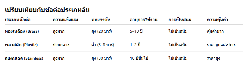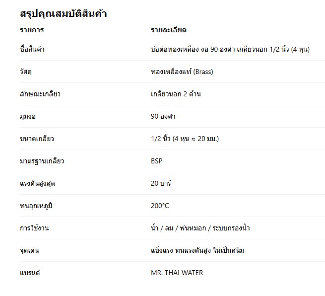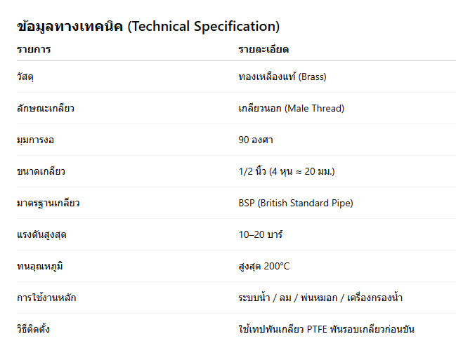 ข้อต่อทองเหลือง งอ 90 องศา เกลียวนอก 1/2 นิ้ว (4 หุน)ข้อต่อทองเหลืองงอ 90 องศา เกลียวนอก 1/2 นิ้ว (4 หุน) หรือ Brass Elbow Male 1/2” (4 หุน) ด้วยการออกแบบให้ “งอ 90 องศา” และ “เกลียวนอกทั้งสองด้าน” ช่วยให้เปลี่ยนทิศทางการไหลของของเหลวหรืออากาศได้อย่างมีประสิทธิภาพ โดยไม่ต้องใช้ท่อยาวหรือข้อต่อหลายชิ้น ช่วยลดการรั่วซึมและทำให้ระบบท่อดูเรียบร้อยขึ้น จุดเด่นของข้อต่อทองเหลืองงอ 90 องศา เกลียวนอก 1/2 นิ้ว1. วัสดุทองเหลืองแท้ แข็งแรง ทนทานผลิตจากทองเหลืองแท้ (Brass) เกรดอุตสาหกรรม ไม่ผสมโลหะราคาถูก จึงแข็งแรง ทนต่อแรงดันและความร้อนสูง ไม่เป็นสนิม และไม่แตกหักง่าย 2. เกลียวนอกมาตรฐาน BSP 1/2” (4 หุน)ใช้เกลียวมาตรฐานสากล BSP (British Standard Pipe) สามารถต่อเข้ากับเกลียวในขนาด 1/2” ได้ทุกประเภท เช่น วาล์ว หัวพ่นหมอก ข้อต่อสาย หรืออุปกรณ์ระบบน้ำทั่วไป 3. มุมงอ 90 องศา เปลี่ยนทิศทางได้สะดวกออกแบบให้เปลี่ยนทิศทางการไหลของของเหลวหรือลมได้ในมุมฉาก เหมาะสำหรับพื้นที่แคบ เช่น ใต้ซิงก์ หลังเครื่องกรองน้ำ หรือจุดต่อระบบลมในโรงงาน 4. ทนแรงดันและอุณหภูมิสูงรองรับแรงดันได้สูงถึง 20 บาร์ และทนความร้อนได้สูงสุดถึง 200°C ใช้งานได้ทั้งระบบแรงดันน้ำและระบบลมอัด 5. อายุการใช้งานยาวนานทองเหลืองเป็นโลหะที่ไม่กัดกร่อนจากน้ำหรืออากาศ ทำให้ข้อต่อรุ่นนี้มีอายุการใช้งานยาวนานหลายปี แม้ใช้งานต่อเนื่องกลางแจ้ง การใช้งานของข้อต่อทองเหลืองงอ 90 องศา เกลียวนอก 1/2 นิ้ว💧 ระบบน้ำ (Water System)ใช้สำหรับต่อระหว่างท่อหรือตัวอุปกรณ์ที่ต้องเปลี่ยนทิศทางการไหลของน้ำ เหมาะสำหรับติดตั้งในบ้าน ร้านกาแฟ หรือระบบกรองน้ำ ☁️ ระบบพ่นหมอก (Fog System)ใช้ต่อกับหัวพ่นหมอกหรือท่อแรงดันสูงในร้านกาแฟ ฟาร์ม หรือโรงเรือน เพื่อเปลี่ยนทิศทางการพ่นหมอกได้ตามต้องการ 🧰 ระบบลม (Air System)เหมาะกับระบบลมอัดในโรงงาน เครื่องจักร หรืออุปกรณ์ที่ต้องการข้อต่อแรงดันสูง ไม่รั่วซึม 🌿 งานเกษตรอุตสาหกรรมใช้ในระบบน้ำเกษตร เช่น ระบบพ่นหมอกแรงดันสูง ระบบรดน้ำอัตโนมัติ และระบบสปริงเกอร์ จุดเด่นเพิ่มเติม