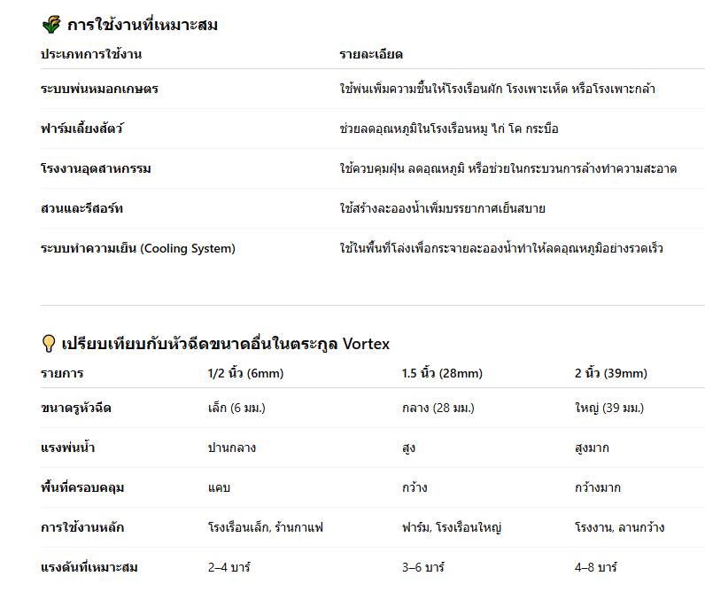 💧 จุดเด่นของหัวฉีด ABS Vortex 1.5นิ้ว DN401. พ่นละอองละเอียด กระจายแรงสม่ำเสมอหัวฉีดรุ่นนี้มีช่องหมุนวน (Vortex Chamber) ที่ช่วยเร่งการหมุนของน้ำก่อนออกจากรูหัวฉีด ทำให้เกิดแรงหมุนระดับสูงและแยกตัวเป็นละอองกลวงอย่างสวยงาม เหมาะกับงานที่ต้องการละอองละเอียดแต่ครอบคลุมพื้นที่กว้าง 2. วัสดุ ABS ทนทานต่อสภาพอากาศพลาสติก ABS (Acrylonitrile Butadiene Styrene) มีคุณสมบัติเด่นคือแข็งแรง ยืดหยุ่น ไม่กรอบแตกเมื่อโดนแดด และทนต่อแรงดันน้ำสูง จึงใช้งานได้ยาวนานทั้งในและนอกอาคาร 3. ติดตั้งง่าย ใช้ได้กับข้อต่อมาตรฐาน 1.5 นิ้วสามารถหมุนเข้ากับท่อ PVC หรือข้อต่อทองเหลือง 1.5 นิ้วได้ทันที โดยใช้เทปพันเกลียวเพียงเล็กน้อยเพื่อป้องกันการรั่วซึม เหมาะสำหรับผู้ที่ต้องการติดตั้งเองในระบบน้ำขนาดกลางถึงใหญ่ 4. เหมาะสำหรับทุกระบบพ่นหมอกหัวฉีดแบบกลวงช่วยให้ละอองกระจายทั่วพื้นที่ เหมาะกับการใช้งานในระบบพ่นหมอกแบบแรงดันกลาง เช่น โรงเพาะเห็ด ฟาร์มสัตว์ หรือระบบทำความเย็นในโรงงาน 5. ประหยัดน้ำแต่ยังคงประสิทธิภาพแม้จะเป็นหัวฉีดขนาดใหญ่ แต่ระบบพ่นแบบ Vortex จะช่วยให้ละอองน้ำกระจายได้ดีโดยไม่ต้องใช้น้ำมาก ทำให้ช่วยประหยัดน้ำได้ในระยะยาว ⚙️ หลักการทำงานของหัวฉีด Vortexหัวฉีด ABS Vortex ใช้หลักการ “หมุนวนของของเหลว” (Vortex Flow Principle) โดยเมื่อของเหลวไหลเข้าสู่ช่องหมุนภายในหัวฉีด จะถูกหมุนด้วยแรงเหวี่ยงจนแตกตัวออกเป็นละอองน้ำละเอียด และพ่นออกในลักษณะ กรวยกลวง (Hollow Cone) ข้อดีของระบบนี้คือสามารถสร้างละอองที่มีความละเอียดสูงและกระจายตัวได้สม่ำเสมอ เหมาะกับการใช้งานที่ต้องการความชื้นหรือการพ่นครอบคลุมทั่วบริเวณ ![]() 🔩 วิธีติดตั้งหัวฉีด ABS Vortex 1.5 นิ้ว DN40