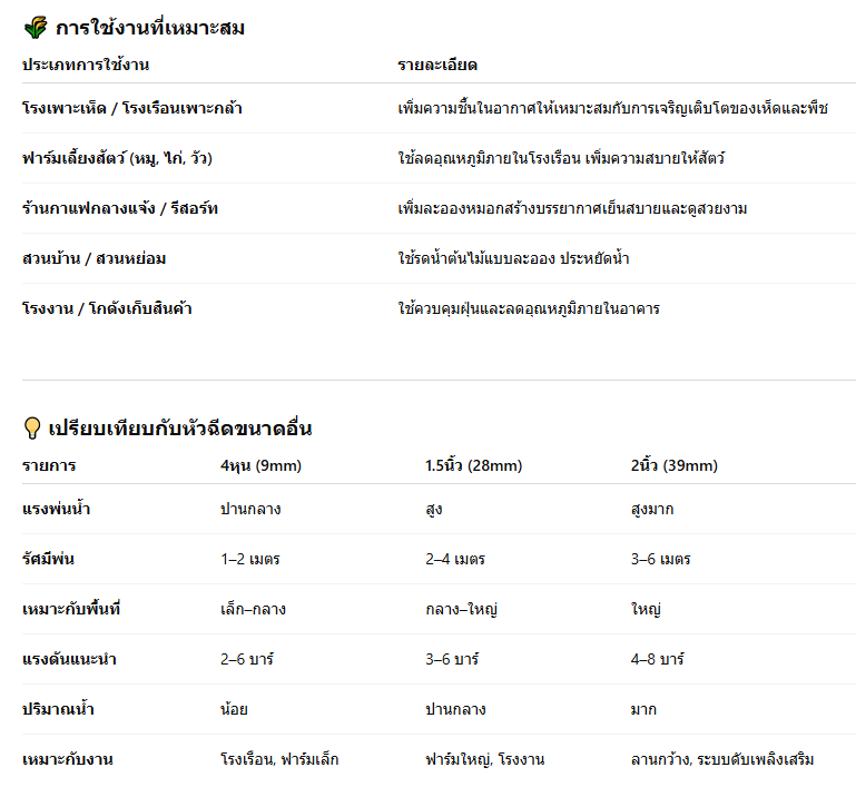 เหมาะกับระบบพ่นหมอกทั่วไปที่ใช้ปั๊มน้ำขนาดเล็กหรือแรงดันไม่สูงมากนัก แต่ยังให้ละอองที่ละเอียดและแรงสม่ำเสมอ