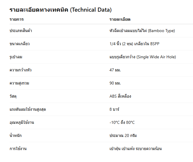 หัวฉีดเป่าลมแบบไม้ไผ่อเนกประสงค์ 1/4 นิ้ว เกลียวใน (รูเดียวกว้าง 47 มม.) สีเหลืองหัวฉีดลมทรงไม้ไผ่ ลมแรง แผ่กว้าง ใช้งานได้หลากหลาย ภาพรวมสินค้าหัวฉีดเป่าลมแบบไม้ไผ่ (Bamboo Type Air Blow Nozzle) รุ่นนี้เป็น แบบเกลียวใน (Female Thread) ขนาด 1/4 นิ้ว (2 หุน) ตัวหัวกว้าง 47 มม. ผลิตจากวัสดุ ABS สีเหลืองเกรดอุตสาหกรรม แข็งแรง ทนแรงดัน และไม่เป็นสนิม เหมาะสำหรับใช้ในงานอุตสาหกรรมทั่วไป งานช่าง หรือแม้แต่งาน DIY ที่ต้องการเป่าฝุ่น เป่าแห้ง หรือระบายความร้อนของชิ้นงาน เนื่องจากหัวฉีดรุ่นนี้มีการออกแบบช่องเป่าลมแบบ รูเดี่ยวแผ่กว้าง (Single Wide Airflow) ทำให้ลมออกแบบเส้นตรงและกระจายกว้างกว่าหัวฉีดลมทั่วไป จุดเด่นของหัวฉีดเป่าลมไม้ไผ่เกลียวใน1. รูปทรงไม้ไผ่ ออกแบบตามหลักอากาศพลศาสตร์ลมที่ผ่านหัวฉีดจะถูกบีบให้พุ่งออกแบบเส้นตรงและกว้างในแนวระนาบ คล้ายลมพัดแบบ “ม่านลม” (Air Curtain) ซึ่งเหมาะสำหรับการเป่าฝุ่นออกจากพื้นผิว หรือเป่าความชื้นให้แห้งในเวลาสั้น 2. ระบบเกลียวใน (Female Thread) มาตรฐาน 1/4 นิ้วหัวฉีดรุ่นนี้ใช้เกลียวในมาตรฐาน BSPP 1/4 นิ้ว ทำให้สามารถต่อกับข้อต่อลม ปืนลม หรือท่อลมได้อย่างแน่นหนา โดยไม่ต้องใช้อะแดปเตอร์เพิ่มเติม 3. ผลิตจากวัสดุ ABS คุณภาพสูงตัวหัวผลิตจาก ABS (Acrylonitrile Butadiene Styrene) มีความแข็งแรง น้ำหนักเบา และทนแรงดันลมได้สูงสุดถึง 8 บาร์ เหมาะสำหรับงานที่ต้องการใช้งานต่อเนื่องเป็นเวลานาน 4. ลมแผ่กว้างและสม่ำเสมอด้วยขนาดปากกว้าง 47 มม. หัวฉีดสามารถกระจายลมได้เต็มพื้นที่ เหมาะกับการเป่าชิ้นงานขนาดใหญ่ เช่น แผ่นโลหะ ขวดแก้ว หรือชิ้นส่วนพลาสติกในสายการผลิต 5. น้ำหนักเบา ไม่เป็นสนิม และใช้งานได้ทั้งในร่มและกลางแจ้งไม่ว่าจะใช้งานในเครื่องจักรอุตสาหกรรม โรงงานผลิต หรือใช้ในงานช่างทั่วไป หัวฉีดรุ่นนี้สามารถใช้งานได้โดยไม่ต้องกังวลเรื่องสนิมหรือการผุกร่อน การใช้งานที่เหมาะสม🔹 งานอุตสาหกรรมทั่วไปใช้ในสายการผลิต เช่น เครื่องกลึง เครื่องตัด CNC เครื่องพ่นสี หรือเครื่องล้างชิ้นงาน 🔹 งานระบายความร้อนช่วยเป่าลดอุณหภูมิของชิ้นงานโลหะหรือพลาสติกที่ผ่านกระบวนการเชื่อมหรือขึ้นรูป 🔹 งานเป่าฝุ่นและทำความสะอาดใช้เป่าฝุ่นออกจากเครื่องจักร แม่พิมพ์ หรืออุปกรณ์อิเล็กทรอนิกส์ 🔹 งานเป่าความชื้นเหมาะสำหรับเป่าหลังการล้าง เช่น แผ่นเหล็ก ขวด แก้ว หรือชิ้นส่วนในสายพานผลิต 🔹 งาน DIY และซ่อมบำรุงทั่วไป