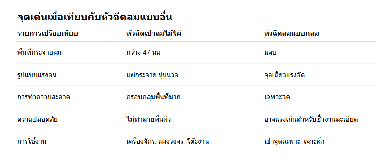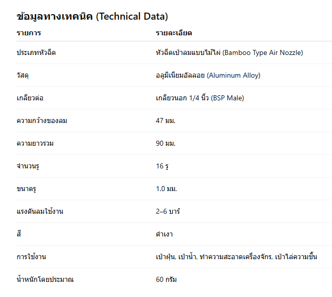 หัวฉีดเป่าลมแบบไม้ไผ่ เกลียวนอก 1/4 นิ้ว กว้าง 47 มม. สีดำเงาอลูมิเนียมอัลลอยคุณภาพสูง แรงลมแรง ทนทาน ใช้งานได้ยาวนาน หัวฉีดเป่าลมแบบไม้ไผ่คืออะไร และทำไมจึงนิยมในงานอุตสาหกรรมหัวฉีดเป่าลมแบบไม้ไผ่ (Bamboo Air Nozzle) เป็นอุปกรณ์ที่ออกแบบมาเพื่อใช้เป่าลมแรงดันสูงในงานอุตสาหกรรมหรือโรงงานต่าง ๆ ลักษณะของหัวฉีดจะเป็นแผ่นแบนคล้ายปลายไม้ไผ่ที่ผ่าออก ซึ่งช่วยให้แรงลมกระจายได้อย่างสม่ำเสมอและกว้างกว่าแบบหัวกลมทั่วไป คุณสมบัติเด่นของหัวฉีดเป่าลมแบบไม้ไผ่ 1/4 นิ้ว รุ่นกว้าง 47 มม.1. ผลิตจากอลูมิเนียมอัลลอย (ALUMINUM ALLOY)วัสดุอลูมิเนียมอัลลอยเกรดอุตสาหกรรมมีความแข็งแรง น้ำหนักเบา ไม่เป็นสนิม และทนต่อแรงดันลมสูง เหมาะกับการใช้งานในระยะยาว 2. แรงลมกระจายกว้าง 47 มม.ปลายหัวกว้าง 47 มม. ออกแบบให้มีรูอากาศ 16 รู ขนาดรูละ 1.0 มม. เพื่อกระจายลมอย่างสม่ำเสมอ ช่วยให้การเป่าล้างหรือเป่าฝุ่นทำได้อย่างมีประสิทธิภาพและครอบคลุมพื้นที่กว้าง 3. เกลียวนอก 1/4 นิ้ว มาตรฐาน BSPสามารถเชื่อมต่อกับข้อต่อแบบเกลียว BSP ได้ง่าย ติดตั้งกับสายลมและปืนลมได้ทุกยี่ห้อที่ใช้มาตรฐานเดียวกัน 4. ดีไซน์แบนคล้าย “ไม้ไผ่”ช่วยให้ทิศทางลมแผ่กว้างและแรงลมไม่กระจุกตัว ทำให้ไม่กระแทกพื้นผิวมากเกินไป เหมาะสำหรับเป่าชิ้นงานที่ต้องการความละเอียด เช่น แผงวงจร ชิ้นส่วนอิเล็กทรอนิกส์ หรือชิ้นส่วนเครื่องจักรที่มีร่องซับซ้อน 5. เคลือบผิวสีดำเงาให้ความสวยงามแบบเรียบหรู ดูสะอาด ทนรอยขีดข่วน และง่ายต่อการทำความสะอาด การใช้งานของหัวฉีดเป่าลมแบบไม้ไผ่1. งานเป่าฝุ่นในโรงงานอุตสาหกรรมใช้เป่าฝุ่นผง โลหะ หรือเศษวัสดุออกจากเครื่องจักรหรือสายการผลิตได้อย่างรวดเร็วโดยไม่ทำลายพื้นผิวของอุปกรณ์ 2. งานเป่าล้างชิ้นส่วนเครื่องจักรช่วยไล่น้ำหรือน้ำมันออกจากผิวชิ้นส่วนหลังการล้าง ช่วยลดเวลาการอบแห้งและเพิ่มประสิทธิภาพการผลิต 3. งานเป่าชิ้นส่วนอิเล็กทรอนิกส์กระแสลมสม่ำเสมอ ไม่แรงจนเกินไป จึงปลอดภัยต่อการเป่าทำความสะอาดแผงวงจรหรืออุปกรณ์ที่มีความละเอียดสูง 4. งานทั่วไปในโรงซ่อมนิยมใช้ร่วมกับปืนลม (Air Blow Gun) เพื่อเป่าฝุ่นภายในรถยนต์ เครื่องจักร หรือโต๊ะทำงาน วิธีการติดตั้งหัวฉีดเป่าลม