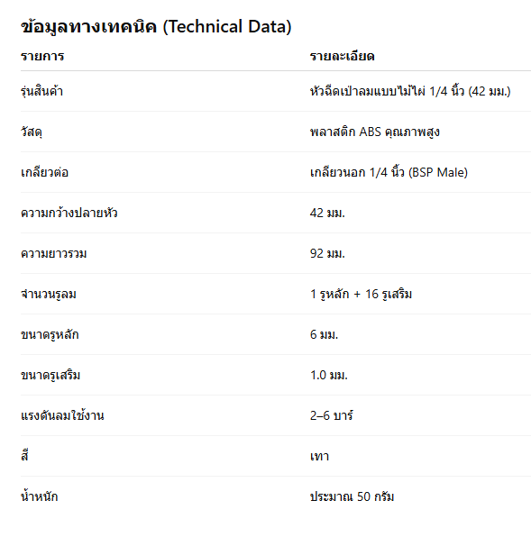 หัวฉีดเป่าลมแบบไม้ไผ่ เกลียวนอก 1/4 นิ้ว 1 รู กว้าง 42 มม. สีเทาอุปกรณ์หัวฉีดลมคุณภาพสูง สำหรับงานเป่าฝุ่น เป่าน้ำ และทำความสะอาดชิ้นงาน ทำความรู้จักกับ “หัวฉีดเป่าลมแบบไม้ไผ่”หัวฉีดเป่าลมแบบไม้ไผ่ (Bamboo Air Nozzle) คืออุปกรณ์ที่ออกแบบมาเพื่อใช้กระจายลมแรงดันสูงให้กว้างและสม่ำเสมอมากกว่าหัวฉีดลมทั่วไป ลักษณะของหัวจะเป็นทรงแบนคล้าย “ไม้ไผ่ผ่า” จึงได้ชื่อเรียกนี้ จุดเด่นคือสามารถควบคุมทิศทางและแรงลมได้ดี โดยใช้ลมปริมาณไม่มากแต่ได้แรงลมมากขึ้น หัวฉีดชนิดนี้เหมาะสำหรับการใช้งานในสายการผลิต โรงงานอุตสาหกรรม อู่ซ่อมรถ หรือในงานช่างทั่วไปที่ต้องการความแม่นยำและความสะอาด เช่น เป่าฝุ่นจากชิ้นงานโลหะ เป่าเศษน้ำหลังล้าง หรือเป่าทำความสะอาดเครื่องจักร คุณสมบัติเด่นของหัวฉีดเป่าลมไม้ไผ่ 1/4 นิ้ว รุ่นกว้าง 42 มม.1. ผลิตจากวัสดุ ABS คุณภาพสูงหัวฉีดทำจากพลาสติกวิศวกรรม ABS (Acrylonitrile Butadiene Styrene) แข็งแรง ทนต่อแรงดันและแรงกระแทกได้ดี ไม่แตกหักง่าย และมีน้ำหนักเบา ช่วยลดแรงต้านเมื่อใช้งานต่อเนื่องเป็นเวลานาน 2. เกลียวนอกขนาดมาตรฐาน 1/4 นิ้วสามารถเชื่อมต่อกับปืนลมและข้อต่อระบบลมได้ทุกรุ่น รองรับเกลียว BSP และ NPT ทำให้ติดตั้งง่าย ปลอดภัย และไม่รั่วซึม 3. ปลายกว้าง 42 มม.ออกแบบให้ลมกระจายกว้างในแนวระนาบ เหมาะกับการเป่าพื้นที่ขนาดใหญ่ เช่น แผ่นเหล็ก ชิ้นงาน หรือโต๊ะงานในสายการผลิต 4. รูเป่าลม 1 รูหลัก พร้อมช่องระบายลมเสริมมีช่องเป่าลมขนาด 1.0 มม. จำนวน 16 ช่องเล็ก และรูหลักตรงกลางขนาด 6 มม. ช่วยเพิ่มแรงลมตรงกลางขณะยังคงความนุ่มนวลของกระแสลมรอบข้าง 5. สีเทาเรียบ ดูมืออาชีพพื้นผิวสีเทาแบบด้าน ช่วยลดการสะท้อนของแสงในพื้นที่ทำงาน และดูสะอาดทันสมัย เหมาะสำหรับใช้งานในโรงงานและห้องปฏิบัติการ ประโยชน์การใช้งาน✅ ใช้เป่าฝุ่นในเครื่องจักรหัวลมแผ่กว้างช่วยกำจัดฝุ่น เศษผง และเศษโลหะออกจากพื้นที่ได้อย่างรวดเร็วโดยไม่ทำลายชิ้นงาน ✅ เป่าน้ำหลังล้างชิ้นส่วนเหมาะกับการไล่ความชื้นหรือน้ำจากผิววัสดุ เช่น เหล็ก สแตนเลส หรือพลาสติก เพื่อเตรียมเข้าสู่กระบวนการต่อไป ✅ ใช้เป่าชิ้นงานในสายการผลิตช่วยให้ขั้นตอนผลิตสะอาด ปลอดฝุ่น และลดความเสียหายของผลิตภัณฑ์ก่อนบรรจุ ✅ ใช้ในงานช่างทั่วไปสามารถติดตั้งกับปืนลมเพื่อเป่าฝุ่น โต๊ะงาน อุปกรณ์ หรือชิ้นส่วนยานยนต์ได้ง่าย การติดตั้งและการใช้งาน