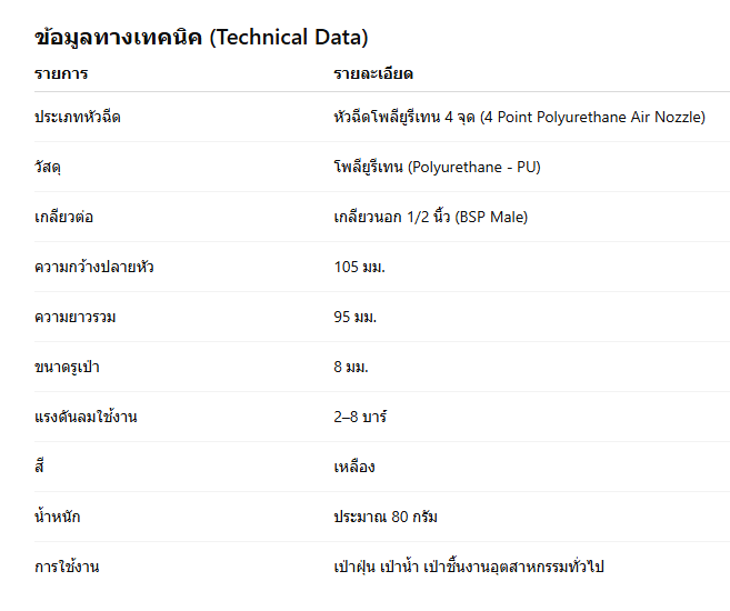 หัวฉีดโพลียูรีเทน 4 จุด (สีเหลือง) – เส้นผ่านศูนย์กลางรู 8 มม.หัวฉีดลมคุณภาพสูง ผลิตจากโพลียูรีเทน แข็งแรง ทนแรงดัน เหมาะกับทุกงานอุตสาหกรรม หัวฉีดโพลียูรีเทนคืออะไร?หัวฉีดโพลียูรีเทน (Polyurethane Air Nozzle) เป็นอุปกรณ์สำหรับเป่าลมแรงดันสูงที่ได้รับความนิยมในภาคอุตสาหกรรมและงานซ่อมบำรุงทั่วไป ด้วยคุณสมบัติของวัสดุโพลียูรีเทนที่มีความยืดหยุ่นสูง ทนต่อแรงดัน ทนการสั่นสะเทือน และไม่แตกหักง่าย หัวฉีดรุ่นนี้ออกแบบให้มีช่องลม 4 จุด (หรือที่เรียกกันว่าหัวลมแผ่) ทำให้ลมที่ออกมามีแรงดันคงที่และกระจายกว้าง เหมาะสำหรับการเป่าฝุ่น เป่าชิ้นงาน หรือเป่าน้ำออกจากพื้นผิวในสายการผลิต จุดเด่นของหัวฉีดโพลียูรีเทน 4 จุด (สีเหลือง)1. ผลิตจากโพลียูรีเทนแท้ (Polyurethane – PU)วัสดุ PU มีความแข็งแรงและยืดหยุ่นสูง ทนแรงดัน ทนต่อแรงกระแทกและการกัดกร่อนจากน้ำหรือน้ำมัน เหมาะกับงานที่ต้องการความทนทานในระยะยาว 2. ดีไซน์หัวแผ่ 4 ช่องลมปลายหัวแผ่กว้าง 105 มม. พร้อมช่องลม 4 จุด ช่วยกระจายแรงลมได้ทั่วและสม่ำเสมอ แรงลมแรงแต่ไม่ทำลายพื้นผิวของชิ้นงาน 3. เกลียวนอกขนาด 1/2 นิ้ว (BSP)สามารถต่อเข้ากับข้อต่อหรือปืนลมได้ทุกแบบที่ใช้เกลียวมาตรฐาน BSP 1/2 นิ้ว ติดตั้งง่ายและแน่นหนา 4. ขนาดรูเป่า 8 มม.รูขนาด 8 มม. เหมาะสำหรับการเป่าฝุ่นหรือเศษวัสดุที่มีขนาดใหญ่ ใช้ได้ดีในงานที่ต้องการแรงลมปริมาณมาก เช่น เป่าทำความสะอาดเครื่องจักรขนาดใหญ่ หรือพื้นที่กว้าง 5. สีเหลืองสดใส มองเห็นชัดในพื้นที่ทำงานช่วยเพิ่มความปลอดภัยและสะดวกในการระบุตัวอุปกรณ์ ประโยชน์การใช้งานของหัวฉีดโพลียูรีเทน✅ งานเป่าฝุ่นในโรงงานอุตสาหกรรมใช้เป่าฝุ่น เศษโลหะ หรือเศษพลาสติกออกจากเครื่องจักรได้สะดวก ลมแรงและปลอดภัยต่อผิวเครื่อง ✅ งานเป่าชิ้นส่วนหลังล้างช่วยเป่าไล่ความชื้นออกจากพื้นผิววัสดุ ลดระยะเวลาในการอบแห้งและเพิ่มประสิทธิภาพในสายการผลิต ✅ งานซ่อมบำรุง (Maintenance)เหมาะสำหรับงานในอู่ซ่อมรถ โรงงานผลิต หรือพื้นที่ที่ต้องการทำความสะอาดเฉพาะจุด ✅ ใช้ร่วมกับปืนลมในสายการผลิตสามารถติดตั้งกับปืนลมเพื่อเป่าทำความสะอาดเครื่องจักรหรือผลิตภัณฑ์ได้อย่างรวดเร็ว การติดตั้งหัวฉีดลม