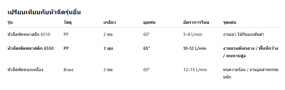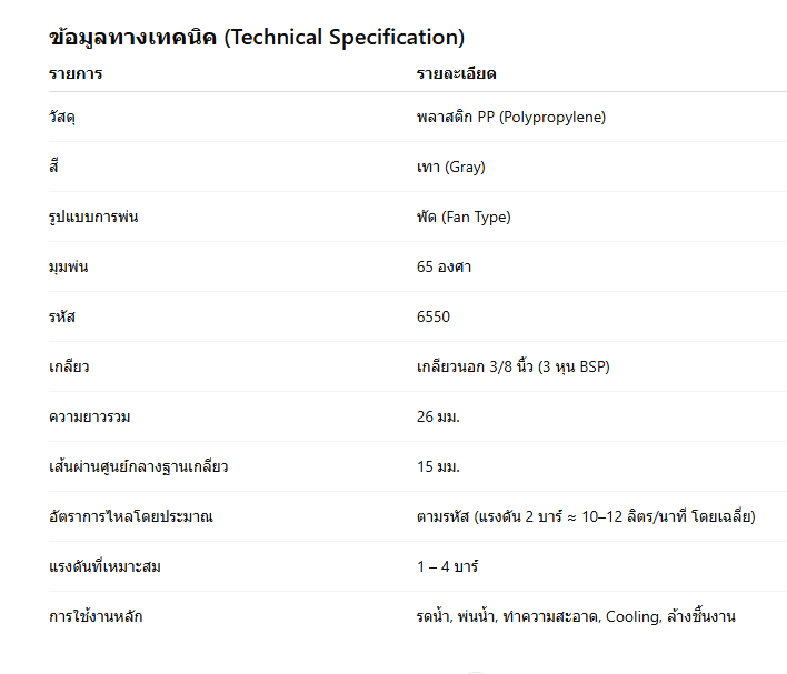 หัวฉีดแบบพัดพลาสติก PP เกลียวนอก 3 หุน รุ่น 6550 (สีเทา)หัวฉีดน้ำแบบพัด หรือที่เรียกว่า Flat Fan Nozzle เป็นหัวฉีดที่ออกแบบมาเพื่อกระจายน้ำในลักษณะพัด ทำให้สามารถพ่นน้ำเป็นแนวกว้างและสม่ำเสมอ เหมาะกับงานรดน้ำ พ่นน้ำ ล้างชิ้นงาน และระบบทำความเย็น โดยเฉพาะรุ่น หัวฉีดแบบพัดพลาสติก PP เกลียวนอก 3 หุน รุ่น 6550 สีเทา จากแบรนด์ MR. THAI WATER – ตัวจริงเรื่องพ่นหมอก จุดเด่นของหัวฉีดแบบพัดพลาสติก PP รุ่น 6550 สีเทา✅ 1. พ่นมุมกว้าง 65° ครอบคลุมทั่วพื้นที่หัวฉีดให้ลำพ่นน้ำในรูปพัดมุม 65° เหมาะกับการกระจายน้ำแบบแนวราบ ทำให้น้ำกระจายตัวอย่างทั่วถึง เหมาะสำหรับพื้นที่ที่ต้องการรดน้ำสม่ำเสมอ เช่น แปลงผัก โรงเพาะเห็ด หรือพื้นโรงงาน ✅ 2. วัสดุพลาสติก PP คุณภาพสูงผลิตจาก Polypropylene (PP) เกรดอุตสาหกรรม แข็งแรง ทนต่อแรงดันสูง และสารเคมีได้ดีเยี่ยม ไม่กรอบ ไม่แตกง่ายเมื่อโดนแสงแดด เหมาะกับการใช้งานกลางแจ้งในระยะยาว ✅ 3. เกลียวนอก 3 หุน (3/8 นิ้ว BSP) มาตรฐานสากลสามารถต่อเข้าท่อ PVC หรือข้อต่อทองเหลืองได้ทันที ใช้งานร่วมกับระบบน้ำทั่วไปได้โดยไม่ต้องใช้ข้อต่อพิเศษ ✅ 4. ออกแบบภายในให้ลื่นไหล ลดแรงดันสูญเสียภายในหัวฉีดมีช่องทางน้ำที่ถูกออกแบบอย่างแม่นยำ เพื่อช่วยให้การไหลของน้ำมีความต่อเนื่อง ไม่เกิดแรงต้าน ลดการสูญเสียแรงดันและให้น้ำพ่นออกได้แรงขึ้น ✅ 5. ใช้งานได้ทั้งงานรดน้ำ พ่นน้ำ และทำความเย็นไม่ว่าจะเป็นระบบรดน้ำในสวน ร้านกาแฟกลางแจ้ง โรงงาน Cooling หรือระบบพ่นน้ำตกแต่ง หัวฉีดรุ่นนี้ตอบโจทย์ได้ทั้งหมด ประโยชน์ของหัวฉีดแบบพัดพลาสติก PP รุ่น 6550