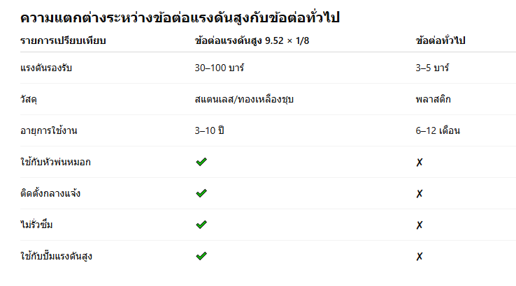 ดังนั้น “ข้อต่อแรงดันสูง เกลียวขันน็อต 9.52 × 1/8” จึงเป็น หนึ่งในชิ้นส่วนที่ต้องเลือกคุณภาพดีที่สุด ทำไมข้อต่อแรงดันสูงชิ้นนี้จึงสำคัญมาก?เพราะมันคือจุดที่รับแรงดันสูงโดยตรง รองรับการทำงานตั้งแต่: