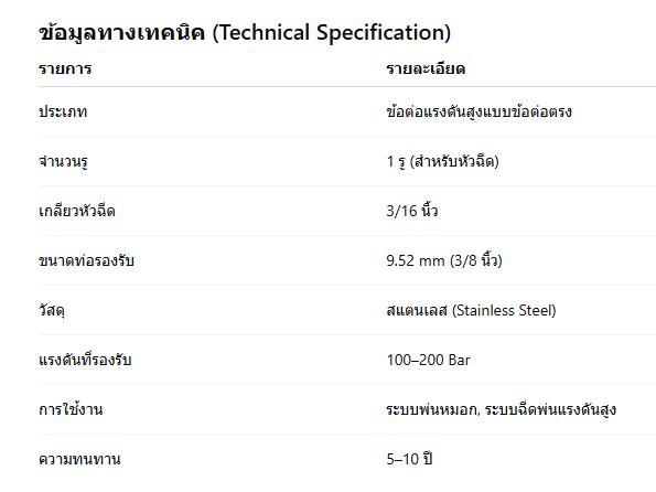 ข้อต่อแรงดันสูง เกลียวขันน็อต ข้อต่อตรง 1 รู (Stainless Steel High Pressure Compression Fitting)ข้อต่อแรงดันสูง เกลียวขันน็อต ข้อต่อตรง 1 รู เป็นอุปกรณ์สำคัญที่ขาดไม่ได้ในระบบพ่นหมอกและระบบฉีดพ่นแรงดันสูง เพราะเป็นจุดเชื่อมต่อระหว่างท่อหลักเข้ากับหัวฉีดแต่ละจุด ช่วยให้ระบบทำงานได้เต็มประสิทธิภาพ ไม่รั่ว ไม่ซึม รองรับแรงดันสูงได้อย่างมั่นใจ เหมาะสำหรับงานด้านการเกษตร โรงเรือนฟาร์มไก่ ร้านกาแฟกลางแจ้ง เต้นท์แอร์ พื้นที่พักผ่อน คาเฟ่เรือนกระจก รวมถึงงานใช้หัวฉีดพ่นในโรงงานอุตสาหกรรม คุณสมบัติเด่นของข้อต่อแรงดันสูงรุ่นนี้1. ผลิตจากสแตนเลสคุณภาพสูง