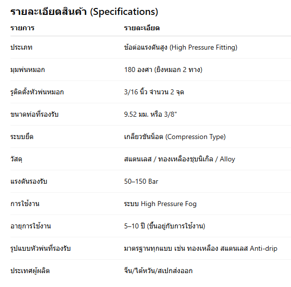 ข้อต่อแรงดันสูง 2 รู 180 องศา เกลียวขันน็อต สำหรับระบบพ่นหมอกแรงดันสูงในระบบ พ่นหมอกแรงดันสูง (High Pressure Fog System) ทุกชิ้นส่วนมีความสำคัญต่อคุณภาพของงาน ไม่ว่าจะเป็นปั๊มแรงดันสูง หัวพ่นหมอก ท่อแรงดันสูง หรือระบบกรองน้ำ แต่หนึ่งชิ้นเล็ก ๆ ที่หลายคนมองข้าม คือ ข้อต่อแรงดันสูง ซึ่งเป็นตัวกลางที่เชื่อมหัวพ่นหมอกเข้ากับท่ออย่างแน่นหนา โดยเฉพาะ ข้อต่อแรงดันสูง 2 รู 180 องศา รุ่นนี้ ที่ถูกออกแบบมาเพื่อใช้กับหัวพ่นหมอก 3/16 นิ้วจำนวน 2 จุด หันออกคนละด้านแบบแนวตรง (Linear Nozzle Mounting) ให้การกระจายละอองหมอกได้ไกลและสมดุลทั้งสองทิศทาง โครงสร้างสินค้า