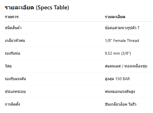 ข้อต่อแรงดันสูง เกลียวขันน็อต ข้อต่อตรง 3 ทาง เกลียวใน 1/8 นิ้ว (T-Fitting)ในระบบพ่นหมอกแรงดันสูง (High Pressure Fog System) ไม่ว่าจะเป็นระบบพ่นหมอกในร้านอาหาร, ระบบเพิ่มความชื้นในโรงเรือน, ระบบลดอุณหภูมิฟาร์มเลี้ยงสัตว์ หรือระบบหมอกคาเฟ่ สิ่งหนึ่งที่เป็นหัวใจสำคัญนอกจากหัวพ่นหมอกและปั๊มแรงดันสูงคือ ข้อต่อแรงดันสูงคุณภาพดี เพราะจุดเชื่อมต่อระหว่างท่อกับหัวพ่นหมอก คือจุดที่พบการรั่วซึมมากที่สุด หากเลือกผลิตภัณฑ์ที่ไม่ได้มาตรฐาน อาจเกิดปัญหาน้ำกระเด็น แรงดันตก หัวพ่นน้ำไม่สม่ำเสมอ หรืออุปกรณ์เสียหายได้ ข้อต่อแรงดันสูง 3 ทาง เกลียวใน 1/8 นิ้ว รุ่นนี้คือคำตอบของงานติดตั้งระดับมืออาชีพ ถูกออกแบบเพื่อใช้งานใน ระบบพ่นหมอกแรงดันสูงถึง 150 บาร์ พร้อมรองรับท่อ 9.52mm และหัวพ่นหมอกแบบเกลียวมาตรฐานสากล โครงสร้างและลักษณะของสินค้าข้อต่อรูปทรง T (Tee Connector) ประกอบด้วย