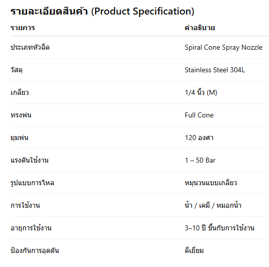 หัวฉีดสเปรย์แบบทรงกรวย Spiral Nozzle สแตนเลส 304L เกลียว 1/4” มุมพ่น 120° — ประสิทธิภาพสูง คงทน รองรับงานอุตสาหกรรมหัวฉีดสเปรย์แบบทรงกรวย (Spiral Cone Nozzle) ผลิตจากวัสดุ สแตนเลสเกรด 304L ที่ให้ความแข็งแรง ทนความร้อน ทนสารเคมี ไม่เป็นสนิม และไม่แตกร้าวง่ายเมื่อใช้งานระยะยาว โดยออกแบบมาเป็นโครงสร้างแบบเกลียวอัดน้ำเพื่อทำให้น้ำหมุนและแตกกระจายออกเป็นละอองรูปทรงกรวย (Full Cone) ด้วยองศาการพ่น 120 องศา หัวฉีดชนิดนี้สามารถทำงานได้ทั้งในระบบพ่นน้ำแรงดันต่ำและแรงดันสูง เหมาะสำหรับโรงงานอุตสาหกรรม โรงเพาะเห็ด ระบบ Cooling Tower ระบบบำบัดน้ำเสีย งานฟาร์ม งานทำความสะอาด หรือระบบลดฝุ่น PM2.5 จุดเด่นของหัวฉีด Spiral Nozzle 1/4” 304L