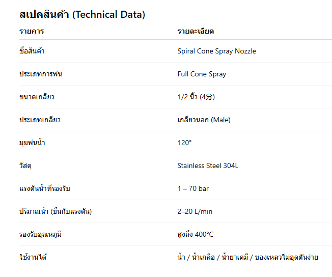 หัวฉีดสเปรย์แบบทรงกรวย Spiral Nozzle สแตนเลส 304L เกลียว 1/2” มุมพ่น 120° หัวฉีดเกลียวขนาดใหญ่ รองรับงานอุตสาหกรรมหนัก งานพ่นน้ำแรงดันสูง และระบบลดฝุ่นหัวฉีดสเปรย์ทรงกรวย Spiral Nozzle คือหัวฉีดประเภท Full Cone ที่พ่นน้ำแบบหมุนวนตามหลัก Fluid Dynamics แตกตัวเป็นละอองน้ำละเอียดในรูปทรง 120 องศา สามารถกระจายน้ำได้กว้าง ใช้น้ำน้อยกว่า และมีประสิทธิภาพสูงในการควบคุมอุณหภูมิ ดักจับฝุ่น ระบบบำบัดอากาศ และในสายการผลิต รุ่นนี้ผลิตจาก สแตนเลสเกรด 304L (มาตรฐาน Food Grade / Industrial Grade) ที่มีปริมาณคาร์บอนต่ำกว่า 304 ปกติ ทำให้ทนทานต่อความร้อนสูง การกัดกร่อน และสารเคมีได้ดีเยี่ยม เหมาะอย่างยิ่งสำหรับงานโรงงานอุตสาหกรรมหนัก (Heavy Duty) จุดเด่น (Key Features)✔ พ่นละอองแบบ Full Cone (ทรงกรวยเต็ม) รูปแบบการทำงานของ Spiral Nozzleหัวฉีด Spiral ใช้หลักการ Hydraulic Atomization