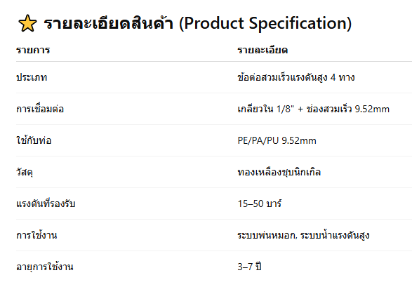 ⭐ ข้อต่อสวมเร็วแรงดันสูง 4 ทาง เกลียวใน 1/8 เลือกแบบไหนดี? รุ่นนี้เหมาะกับงานพ่นหมอกที่สุดในปี 2025ข้อต่อสวมเร็วแรงดันสูง (Quick Fitting / Quick Connector) เป็นหนึ่งในอุปกรณ์ที่ขาดไม่ได้ในระบบน้ำ โดยเฉพาะงานพ่นหมอกและงานแรงดันสูงที่ต้องการความแข็งแรง ไม่รั่วซึม และติดตั้งง่าย รุ่นนี้ออกแบบมาเพื่องานหนักโดยเฉพาะ ทั้งรีสอร์ต ฟาร์ม ร้านกาแฟโรงเรือน และงานอุตสาหกรรมทุกรูปแบบ ใช้กับท่อขนาด 9.52mm ซึ่งเป็นมาตรฐานระบบพ่นหมอกแรงดันสูงของไทย ⭐ ทำไมต้องเลือกข้อต่อสวมเร็ว 4 ทาง เกลียวใน 1/8 สำหรับระบบพ่นหมอกแรงดันสูงงานพ่นหมอกจำเป็นต้องใช้อุปกรณ์ที่ทนแรงดันและปลอดภัย ข้อต่อแบบ 4 ทางรุ่นนี้ตอบโจทย์ทุกด้าน ทั้งความแข็งแรง ความสะดวก และประสิทธิภาพในการกระจายน้ำหลายทิศทาง ⭐ รองรับแรงดันสูงได้จริง ไม่แตก ไม่บวม ไม่รั่วผลิตจากทองเหลืองชุบนิกเกิล ซึ่งเป็นวัสดุระดับพรีเมียมในวงการระบบน้ำ ทนแรงดัน 15–50 บาร์ เหมาะกับปั๊ม 100–150 PSI ใช้ได้ทั้งภายนอกและภายในอาคาร ไม่ขึ้นสนิม ไม่กรอบ ไม่เสียรูปง่าย ⭐ รูปแบบ 4 ทาง เหมาะสำหรับระบบที่ต้องการแยกท่อหลายทิศทางช่วยให้เดินท่อเป็นระเบียบ ลดจำนวนชิ้นส่วน เพิ่มความเสถียรของระบบ เหมาะกับการแยกท่อไปยังหัวพ่นหลายจุด เช่น ร้านกาแฟ ฟาร์ม โรงเพาะเห็ด โกดังสินค้า และเรือนปลูกผักไฮโดรโปนิกส์ ⭐ ระบบสวมเร็ว (Quick Insert) ติดตั้งง่าย ประหยัดเวลาไม่ต้องพันเทป ไม่ต้องขันเกลียว ไม่ต้องใช้ประแจ แค่ตัดท่อให้เรียบแล้วเสียบท่อเข้าไป ข้อต่อจะล็อกแน่นอัตโนมัติ ทำให้ประหยัดเวลาได้มากกว่า 80% ⭐ จุดเด่นของข้อต่อสวมเร็วแรงดันสูงรุ่นนี้⭐ วัสดุเกรดสูง ทนร้อน ทน UVไม่ผุ ไม่เป็นสนิม ใช้งานได้ทั้งแดดและฝน ⭐ เกลียวใน 1/8 ใช้กับหัวพ่นทุกรุ่นเข้ากันได้กับหัวพ่นสเตนเลส ทองเหลือง Anti-Drip ทุกรูปแบบ ⭐ ยึดท่อแน่น ไม่มีหลุดด้วยระบบ Dual Lock ทำให้มั่นใจได้แม้เปิดทั้งวัน 24 ชั่วโมง ⭐ การใช้งานที่เหมาะสม