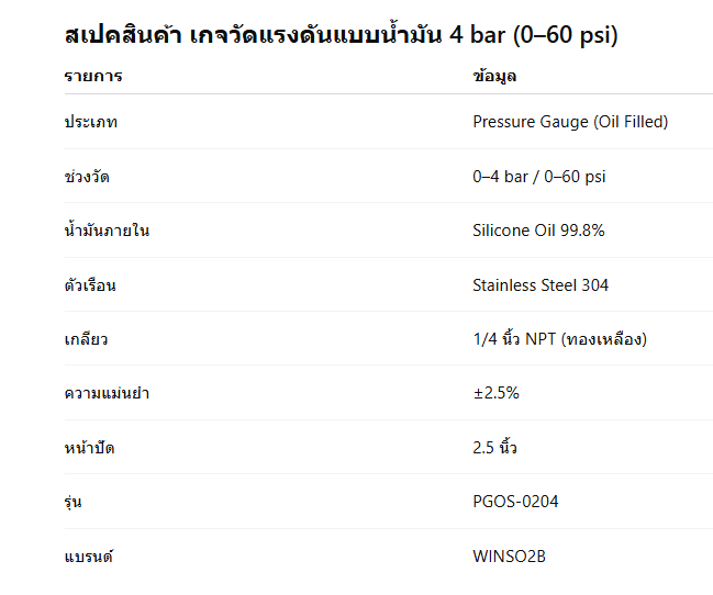 บทสรุปเกจวัดแรงดันแบบน้ำมัน 4 bar เป็นเกจที่เหมาะสำหรับงานที่ต้องการความนิ่งสูง ลดแรงสั่นสะเทือนของเข็ม และต้องการความทนทาน แข็งแรงในระยะยาว ด้วยตัวเรือนสแตนเลส 304 เกลียวทองเหลือง และน้ำมันซิลิโคนบริสุทธิ์ จึงเป็นทางเลือกที่ดีที่สุดสำหรับงานระบบน้ำ ระบบพ่นหมอก และงานอุตสาหกรรมทั่วไป Call-to-Action (CTA)สั่งซื้อ / ขอราคาแบบร้านค้า / สอบถามสินค้าเพิ่มเติม ติดต่อ MR. THAI WATER