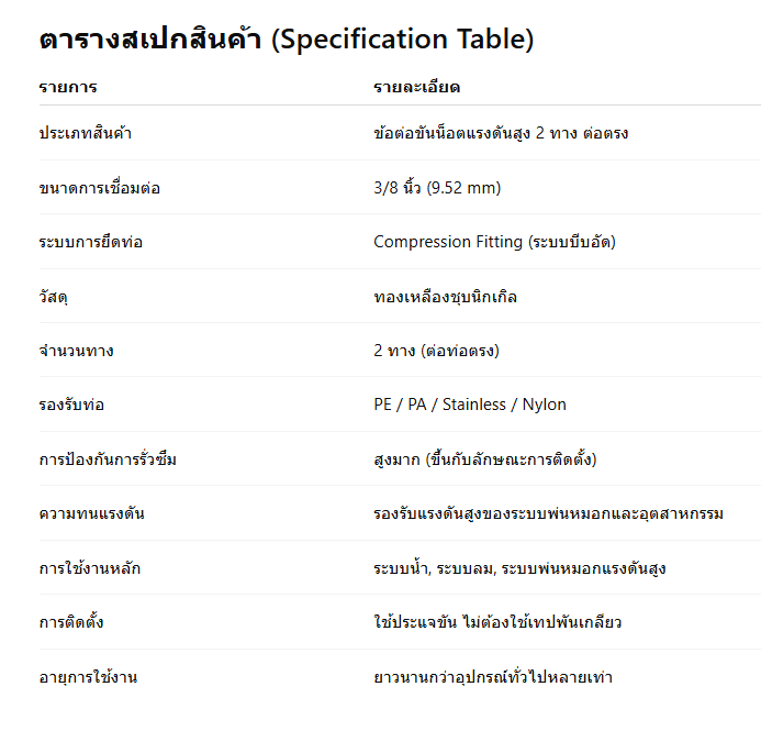 ข้อต่อขันน็อตแรงดันสูง 2 ทาง ต่อตรง 3/8 นิ้ว (High Pressure Compression Straight Fitting) คืออะไรข้อต่อขันน็อตแรงดันสูง 2 ทาง แบบต่อตรง ขนาด 3/8 นิ้ว เป็นอุปกรณ์ต่อท่อที่ถูกออกแบบมาสำหรับงานที่ต้องการความแน่นหนา ความปลอดภัยสูง และความทนทานต่อแรงดันมากเป็นพิเศษ เช่น ระบบพ่นหมอกแรงดันสูง, ระบบท่อในโรงงาน, ระบบลมอัด รวมถึงงานเกษตรหรืออุตสาหกรรมที่ต้องมีการส่งน้ำอย่างต่อเนื่องโดยไม่ให้เกิดการรั่วซึม ข้อต่อรุ่นนี้ผลิตจากวัสดุเกรดสูง คือ ทองเหลืองชุบนิกเกิล (Nickel-Plated Brass) ซึ่งมีคุณสมบัติเหมาะสมสำหรับงานหนัก เพราะไม่เป็นสนิม ทนความดันสูง และอายุการใช้งานยาวนานกว่าข้อต่อทั่วไปหลายเท่า การออกแบบด้วยระบบ Compression Type (ระบบบีบอัด) ทำให้สามารถยึดแน่นกับท่อได้โดยไม่ต้องใช้เทปพันเกลียว และยังสามารถใช้งานร่วมกับท่อหลายประเภท เช่น PE, PA, สเตนเลส หรือท่อไนลอน ทำให้เป็นอุปกรณ์สารพัดประโยชน์สำหรับงานติดตั้งทั้งภายในและภายนอกอาคาร จุดเด่นของข้อต่อขันน็อตแรงดันสูง 3/8 นิ้ว แบบต่อตรงวัสดุแข็งแรง ทนการใช้งานหนักทองเหลืองชุบนิกเกิลมีความแข็งแรงสูง ทนความร้อน ทนแรงดัน และป้องกันการกัดกร่อนได้ดี จึงเหมาะกับงานพ่นหมอกแรงดันสูงและงานระบบท่อที่ต้องการคุณภาพระดับอุตสาหกรรม ป้องกันการรั่วซึม 100%ด้วยระบบบีบอัด (Compression Fitting) ทำให้การเชื่อมต่อแน่นสนิท ไม่มีการรั่วแม้ใช้งานในแรงดันสูงกว่า 80–140 บาร์ (ขึ้นอยู่กับระบบ) รองรับท่อหลายชนิด