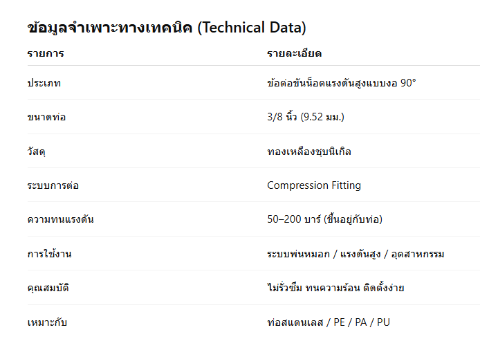 รายละเอียดสินค้า ข้อต่อขันน็อตแรงดันสูงแบบงอ 90° ขนาด 3/8 นิ้วข้อต่อขันน็อตแรงดันสูง 2 ทาง แบบงอ 90 องศา ขนาด 3/8 นิ้ว (Compression Elbow 90°) เป็นอุปกรณ์สำคัญที่ใช้เชื่อมต่อท่อน้ำแรงดันสูงในระบบต่าง ๆ ไม่ว่าจะเป็นระบบพ่นหมอกแรงดันสูง ระบบน้ำเกษตร ระบบรดน้ำต้นไม้อัตโนมัติ ระบบทำความเย็นด้วยละอองน้ำ ไปจนถึงระบบอุตสาหกรรมที่ต้องการความปลอดภัยสูงจากแรงดันภายในท่อ ข้อต่อรุ่นนี้ถูกออกแบบมาเพื่อรองรับงานแรงดันสูงโดยเฉพาะ โครงสร้างภายในใช้ระบบ Compression Fitting ที่อาศัยหลักการบีบอัดของเฟอร์รูล ทำให้เกิดการยึดเกาะรอบท่ออย่างแน่นหนา เมื่อใช้งานร่วมกับท่อสแตนเลสหรือท่อ PE ความดันสูง จะให้ความมั่นใจได้ว่าไม่เกิดการรั่วซึมแม้ใช้งานต่อเนื่องหลายปี วัสดุหลักคือ ทองเหลืองชุบนิเกิล (Nickel Plated Brass) ซึ่งขึ้นชื่อเรื่องความแข็งแรง ทนสนิม ทนความร้อน และเหมาะกับงานแรงดันสูงที่ต้องการอายุการใช้งานยาวนานกว่าอุปกรณ์ทองเหลืองทั่วไป นอกจากนี้การเคลือบนิเกิลยังช่วยเพิ่มความมันวาวและป้องกันการกัดกร่อนจากการใช้งานภายนอกได้ดีมาก จุดเด่นของข้อต่อขันน็อตแรงดันสูงแบบงอ 90° ขนาด 3/8 นิ้วข้อต่อรุ่นนี้ตอบโจทย์การใช้งานได้หลากหลาย ด้วยคุณสมบัติเด่นดังนี้: วัสดุคุณภาพสูงผลิตจาก ทองเหลืองชุบนิเกิลหนา แข็งแรงกว่า ทนแรงดันได้ดี ป้องกันสนิมและการกัดกร่อน เหมาะทั้งงานภายในและภายนอกอาคาร ออกแบบเป็นแบบงอ 90°รองรับงานที่ต้องการเปลี่ยนทิศทางการเดินท่อ โดยไม่ทำให้แรงดันตก ช่วยให้การเดินระบบเป็นระเบียบ สวยงาม และประหยัดพื้นที่ ระบบ Compression ป้องกันการรั่วซึมระบบเฟอร์รูล (Ferrule) จะบีบท่อให้แน่นเมื่อขันเข้ากับน็อต ทำให้ยึดเกาะมั่นคง ไม่หลุดง่าย ไม่ซึม รองรับแรงดันสูงใช้งานได้กับแรงดันสูงตั้งแต่ 50–200 บาร์ (ขึ้นอยู่กับท่อที่ใช้ร่วมกัน) เหมาะสำหรับระบบพ่นหมอกแรงดันสูง 1000 PSI ใช้ได้กับหลายประเภทของท่อรองรับท่อดังนี้: อายุการใช้งานยาวนานไม่เป็นสนิม แม้ใช้กลางแจ้งหรือในพื้นที่ชื้น ทำงานได้ดีแม้สัมผัสความร้อนสูงหรือแรงสั่นสะเทือน การใช้งานของข้อต่อขันน็อตแรงดันสูง 2 ทาง งอ 90° 3/8 นิ้วสามารถนำไปใช้ในงานระบบต่าง ๆ เช่น: ระบบพ่นหมอกแรงดันสูง– ร้านกาแฟ ระบบน้ำอุตสาหกรรม– ระบบควบคุมความดัน ระบบท่อภายในอาคาร– ระบบท่อจ่ายน้ำ งานทั่วไปที่ต้องการข้อต่อที่แข็งแรง– ต่ออุปกรณ์ DIY ข้อดีที่ทำให้ข้อต่อรุ่นนี้เหนือกว่าแบบทั่วไป– ทนแรงดันสูงกว่าข้อต่อพลาสติกหลายเท่า คำแนะนำในการติดตั้ง