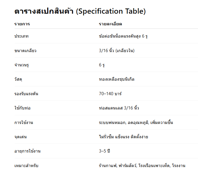 ข้อต่อขันน็อตแรงดันสูง 6 รู เกลียวใน 3/16 นิ้ว อุปกรณ์กระจายท่อแบบครบทิศทางสำหรับระบบพ่นหมอกแรงดันสูงข้อต่อขันน็อตแรงดันสูง 6 รู เกลียวใน 3/16 นิ้ว นับเป็นอุปกรณ์สำคัญสำหรับระบบพ่นหมอกแรงดันสูงที่ต้องการกระจายท่อหลายทิศทางในจุดเดียว ไม่ว่าจะเป็นงานภาคเกษตร งานโรงเรือน งานฟาร์มปศุสัตว์ งานลดอุณหภูมิ หรือระบบควบคุมฝุ่นละออง โดยออกแบบให้มีจำนวนรูมากถึง 6 รู เพื่อรองรับการเชื่อมต่อท่อจำนวนหลายเส้นอย่างมีประสิทธิภาพ ใช้วัสดุทองเหลืองชุบนิเกิลที่ให้ความทนทานสูงและไม่เป็นสนิมแม้เจอละอองน้ำเป็นเวลานาน ด้วยลักษณะเกลียวแบบ เกลียวใน 3/16 นิ้ว ที่เป็นมาตรฐานของระบบพ่นหมอกแรงดันสูง ทำให้ใช้งานร่วมกับท่อสแตนเลส 3/16 นิ้วได้อย่างแน่นสนิท ไม่รั่ว และทนต่อแรงดันสูงระดับ 70–140 บาร์ ซึ่งเป็นแรงดันที่พบมากในระบบหัวพ่นหมอกแบบมืออาชีพ คุณลักษณะสินค้า