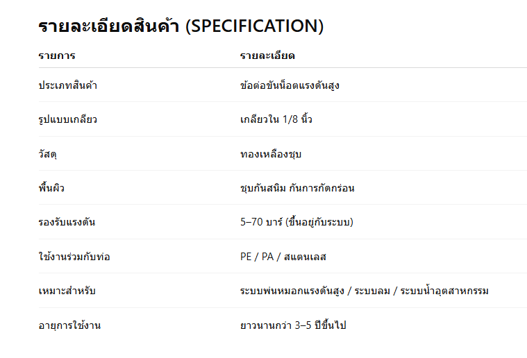 ข้อต่อขันน็อตแรงดันสูง เกลียวใน 1/8 นิ้ว อุปกรณ์สำคัญของระบบน้ำแรงดันสูงที่ทุกงานต้องมีข้อต่อขันน็อตแรงดันสูงแบบเกลียวใน 1/8 นิ้ว คืออุปกรณ์ที่มีความจำเป็นอย่างสูงในงานระบบน้ำ โดยเฉพาะระบบที่ต้องการแรงดันสูงเป็นพิเศษ เช่น ระบบพ่นหมอกไฮเพรสเชอร์ ระบบสเปรย์น้ำในโรงงาน ระบบน้ำเย็น และระบบลมที่ต้องการการซีลที่แม่นยำและปลอดภัย ข้อต่อชนิดนี้ถูกใช้อย่างแพร่หลายในงานอุตสาหกรรม การเกษตร และงานติดตั้งระบบสำหรับร้านอาหารหรือร้านกาแฟ โดยเฉพาะการใช้งานร่วมกับอุปกรณ์พ่นหมอกที่ต้องรับแรงดันสูงถึง 1,000 PSI อุปกรณ์ชิ้นนี้มีจุดเด่นคือการออกแบบที่ให้ความแข็งแรง ทนทานต่อแรงดันและอายุการใช้งานยาวนานกว่าข้อต่อทั่วไป ประกอบง่าย ไม่ต้องบัดกรี และให้การซีลที่ยอดเยี่ยม ซึ่งเป็นเหตุผลที่ข้อต่อขันน็อตแรงดันสูง 1/8 นิ้ว ได้รับความนิยมทั้งในงานช่างมืออาชีพและผู้ใช้งานทั่วไปที่ต้องการติดตั้งระบบน้ำหรือระบบพ่นหมอกด้วยตัวเอง ภาพรวมคุณสมบัติของข้อต่อขันน็อตแรงดันสูง เกลียวใน 1/8 นิ้วการเลือกใช้ข้อต่อเกลียวคุณภาพสูงเป็นขั้นตอนสำคัญในการติดตั้งงานท่อแรงดันสูง ไม่ว่าจะเป็นระบบน้ำ ลม หรือสารเคมีอ่อน ๆ โดยข้อต่อขันน็อตแรงดันสูงรุ่นนี้มีคุณสมบัติที่ตอบโจทย์การใช้งานครบถ้วน ดังนี้ วัสดุทองเหลืองชุบระดับพรีเมียมข้อต่อชนิดนี้ผลิตจากทองเหลืองคุณภาพสูง (Brass) ผ่านการชุบผิวเพื่อเพิ่มความทนทานต่อการกัดกร่อน ทำให้สามารถใช้งานในพื้นที่ที่มีความชื้นสูงหรือต้องสัมผัสกับแรงดันน้ำต่อเนื่องได้โดยไม่เป็นสนิมง่าย อีกทั้งทองเหลืองยังมีคุณสมบัติพิเศษ เช่น
